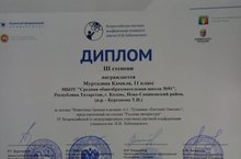 Всероссийская(с Международным участием) конференция им.Н.И. Ломоносова - Евсикова Ангелина 3 место(науч.рук. Дульская Н.П., Панфилова О.А.), Муртазина Камиля - 3 место, Макаров Алексей - участник (науч.рук. Бурганова Т.Н.)