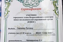 Сергеев Руслан ( 8А кл) стал участников Всероссийского конкурса юных исследователей окружающей среды (ЮИОС), Науч.рук. Четверикова Е.Н.