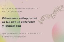 Детская музыкальная школа №17 им.С.З.Сайдашева объявляет дополнительный набор обучающихся на 2022-2023 учебный год на вакантные места.
