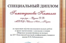 Поздравляем ученицу 9 а класса Гиматдинову Камиллу с получением специального диплома за серьезную научно-исследовательскую работу и яркое выступление с докладом в секции "Мировая художественная культура"