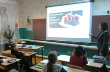 Дәрес барышында һәр этап презентация материаллары белән ныгытып барылды. Ул, үз эченә: урманнарны саклау, һаваның пычрануы, завод-фабрикалардан чыккан калдыкларның урынсыз ташлануы, чүп-чарларны билгеле урынга ташлау, хайваннар һәм кошларны саклау дигән бүлекләрне алды.