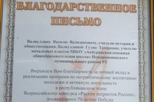Рәхмәт хаты белән Валиуллин В.В. һәм Валиуллина Г.Т. бүләкләнә. Всероссийский конкурс "Растим патриотов России", посвященного 70-летию Победы в ВОВ 1941-1945 годов 31.07.2015