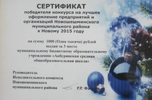 «Кар шәһәрчеге» бәйгесендә 3 нче урын яулаганы өчен Акбүре төп гомуми белем мәктәбе мәгариф бүлегенең 1000 сумлык Сертификаты белән бүләкләнде. 06.01.2015