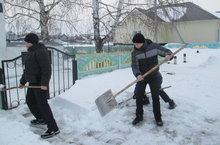 Укучылар Бөек Ватан сугышында һәлак булганнар истәлегенә куелган һәйкәл тирәсен кардан арчыдылар.
