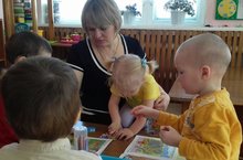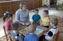 Воспитатель Подопрелова Е.И. с младшей группой воспитанников, работает в прописях по развитию речи, изучают домашних животных и их детёнышей.