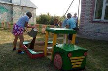 Большим ходом идет подготовка детского сада к приемке. Много уже было сделано и многое предстоит сделать. 25 июля сотрудники детского сада работали на участке, красили игровое оборудование, а так же заменили песок в песочницах.