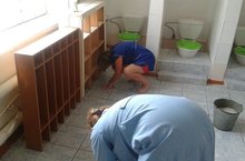 26 июля сотрудники детского сада приступили к побелке стен в детском туалете. Местами стены были заштукатурены и полностью побелены потолок и стены.