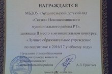 В муниципальном конкурсе «Лучшее образовательное учреждение по подготовке к новому 2016/17 учебному году» мы заняли 2 место. Глава района В.М. Козлов вручил заведующей грамоту и подарочный сертификат на 4 тысячи рублей.