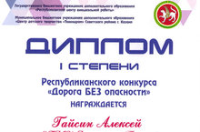 Дипломом 1 степени награждается Гайсин Алексей, за участие в Республиканском конкурсе "Дорога безопасности". Поздравляем тебя Алексей.Желаем дальнейших тебе успехов.
