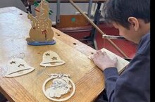 Сегодня на уроках технологии мальчики изготовили новогодние игрушки из дерева, для украшения нашей елки на центральной площади.