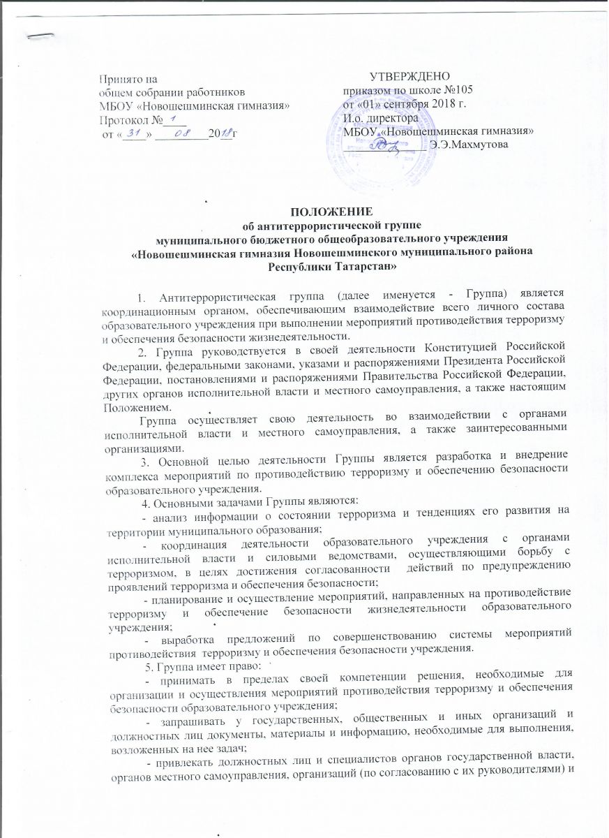 положение об антитеррористической группе МБОУ Новошешминская гимназия/ Яңа Чишмә гимназиясенең террорчылыкка каршы төркеме турында нигезләмә