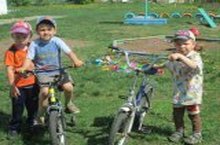 Прогулка детей. Мальчики осваивают навыки езды на велосипеде, а малышам удобно на мотоциклах.