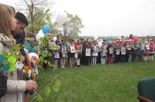 Учащиеся старших классов под руководством Трошиной Е.А. изготавливают цветы и прикрепляют их к зелёным веткам, а завтра они с этими ветками пойдут на праздник.