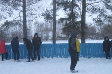 Учащиеся средних и старших классов утаптывают снег для заливки льда.