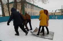 Учащиеся 7 класса под руководством учителя физкультуры -Сабирова И.Т. выравнивают поверхность чтобы залить каток.