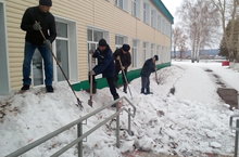Учащиеся, учителя и сотрудники школы в очередной раз вышли на уборку территории. Они раскидали снег, собрали листву и другой мусор.