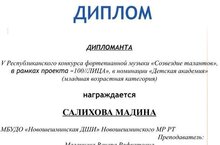 Учащаяся музыкального отделения по специальности фортепиано Салихова Мадина приняла участие в V Республиканском конкурсе фортепианной музыки "Созвездие талантов" в рамках проекта "100//ЛИЦА" в номинации "Детская академия" (младшая возрастная группа) и стала Дипломантом конкурса. Педагог Маланчева В.Р.
