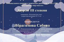 Учащиеся художественного отделения приняли участие в Региональном конкурсе творческих работ с ОВЗ "Разукрасим мир вместе".В номинации "Разноцветные сны" Ибрагимова Сабина (10-13 лет) Стала Лауреатом III степени педагог Старикова О.В., Бобова Дарья (10-13 лет) Дипломант I степени педагог Рамазанова Г.М., Завалишин Кирилл (7-9 лет) Дипломант I степени педагог Леонова Л.И. Поздравляем ребят и их педагогов с отличными результатами, желаем творческих успехов и побед!