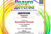 Ученица класса фортепиано Кузнецова Ксения, класс преподавателя Кузнецовой Елены Николаевны, приняла участие в Международном дистанционном конкурсе детского творчества "Радуга детства" в номинации "Сыграй-ка" Фортепиано И.С.Бах Менуэт и стала Лауреатом III степени. Мы поздравляем Ксению и ее педагога Елену Николаевну с победой! Желаем им дальнейших творческих побед!