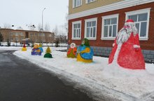 Новогодний хоровод матрешек с Дедом Морозом и Снегурочкой выстроился вдоль фасада детской школы искусств. Разноцветные матрешки в жилетках и красивых платочках среди зеленых елочек украшают здание школы и создают новогоднее настроение детям и взрослым.