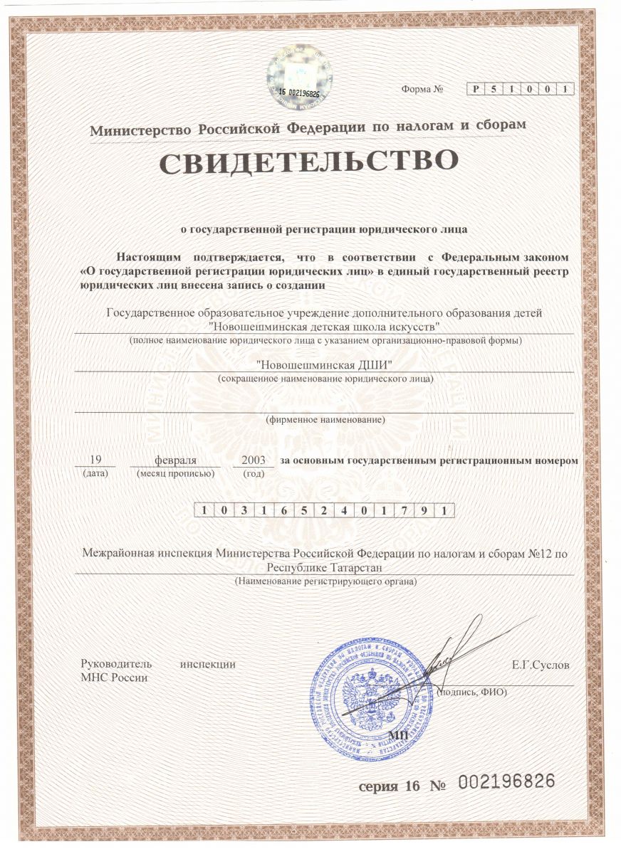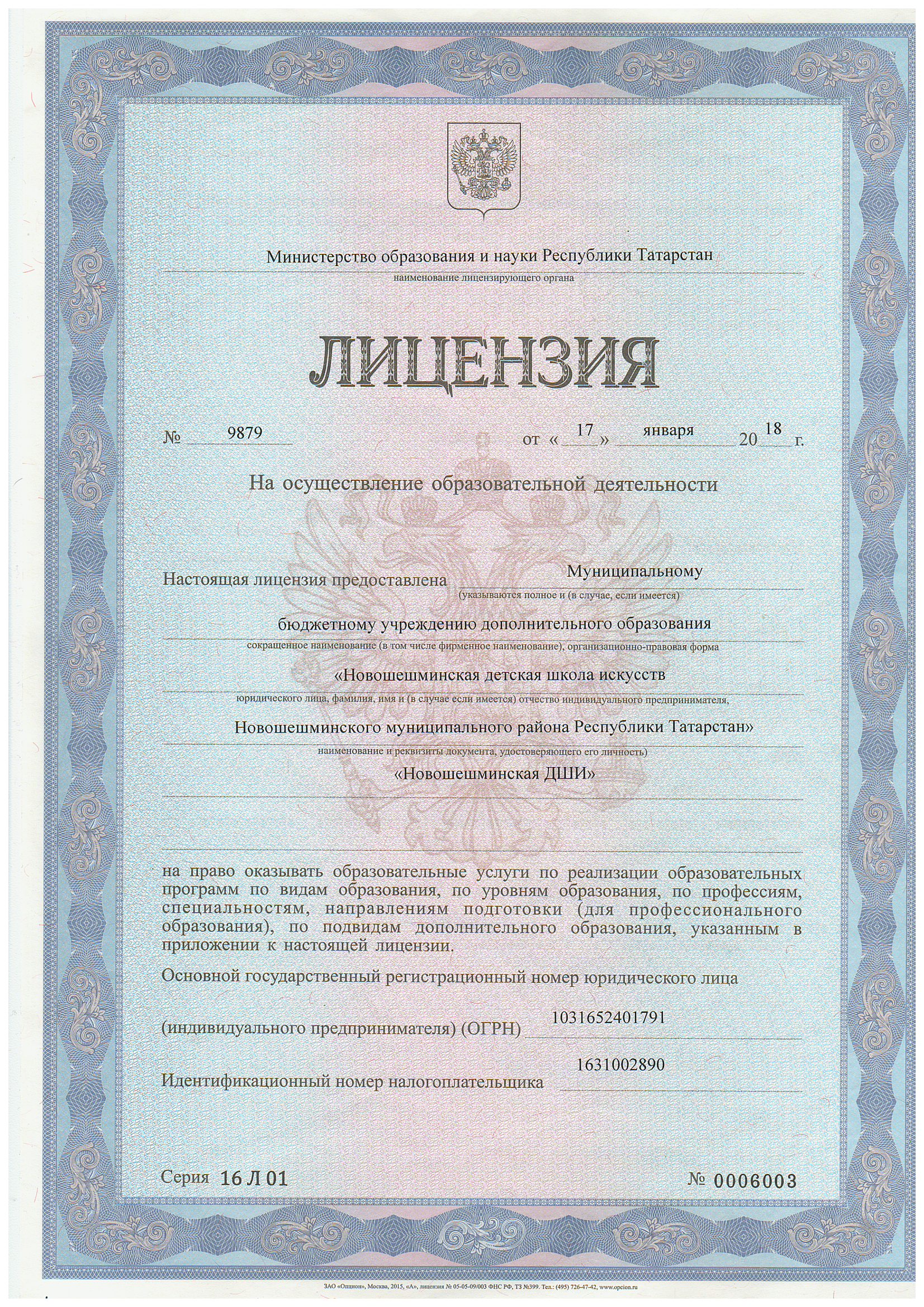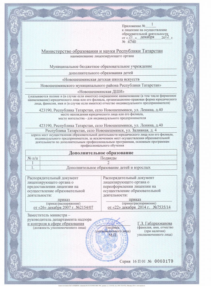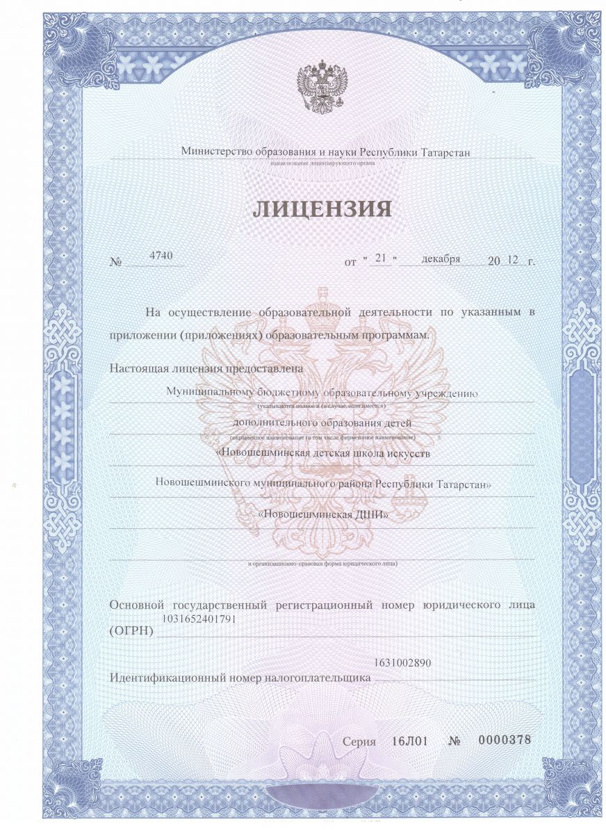 Лицензия МБУДО "Новошешминская ДШИ Новошешминского муниципального района Республики Татарстан"