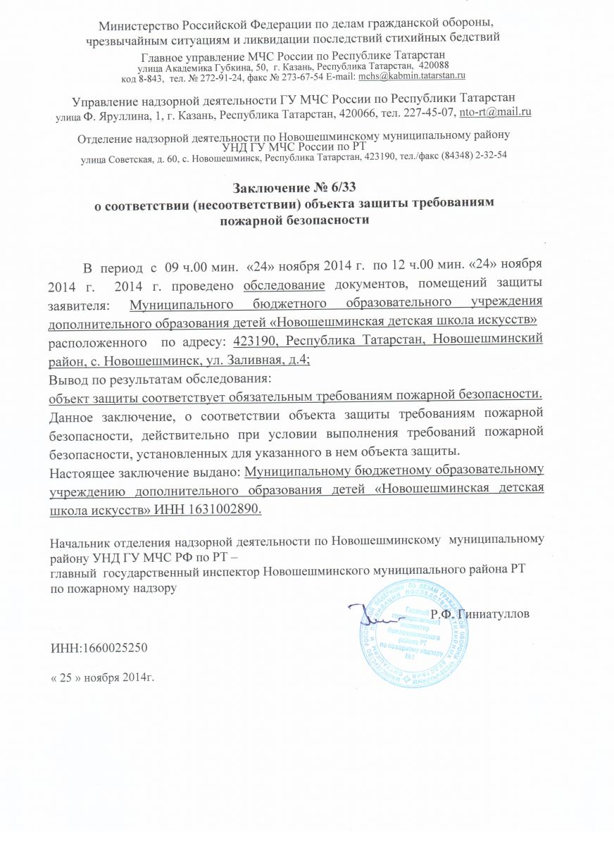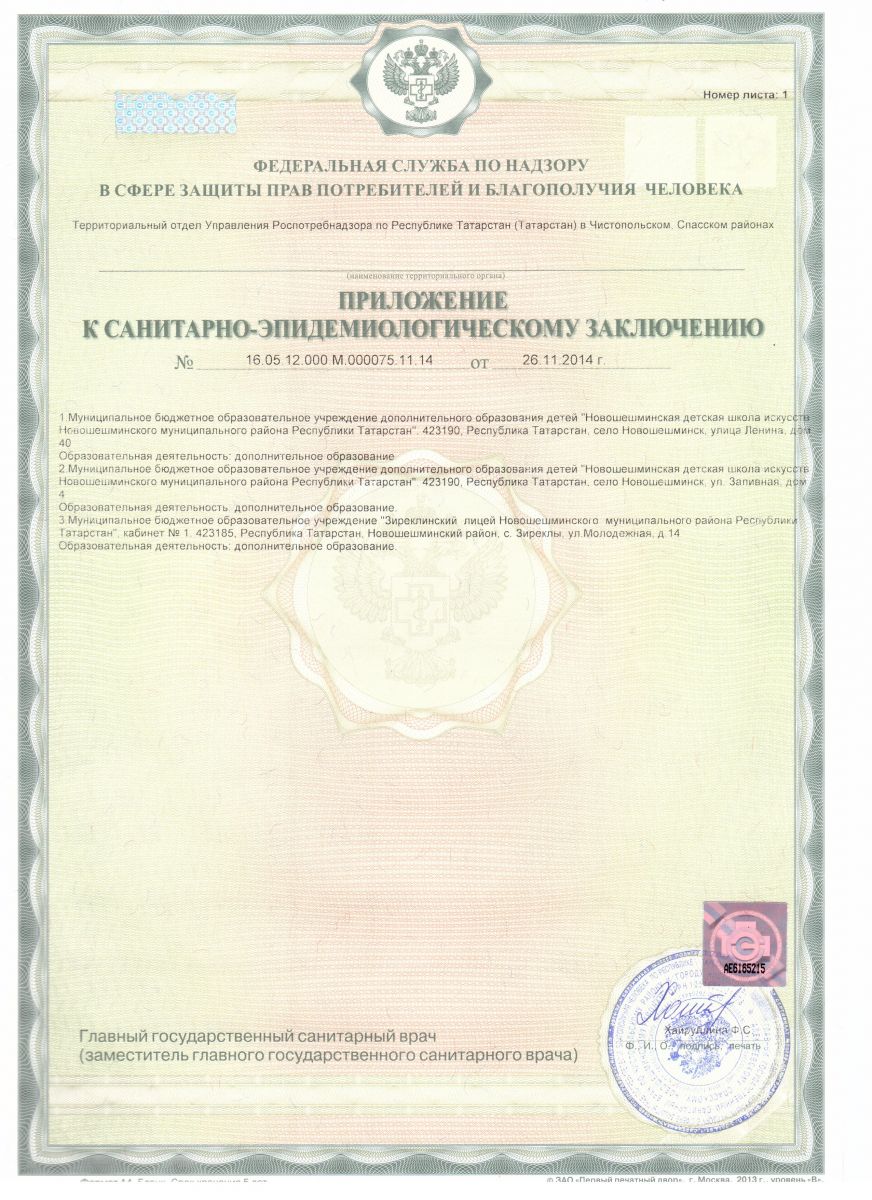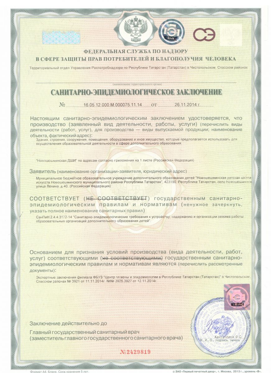 Санатарно -эпидемиологическое заключение по МБУДО "Новошешминская ДШИ Новошешминского муниципального района Республики Татарстан"
