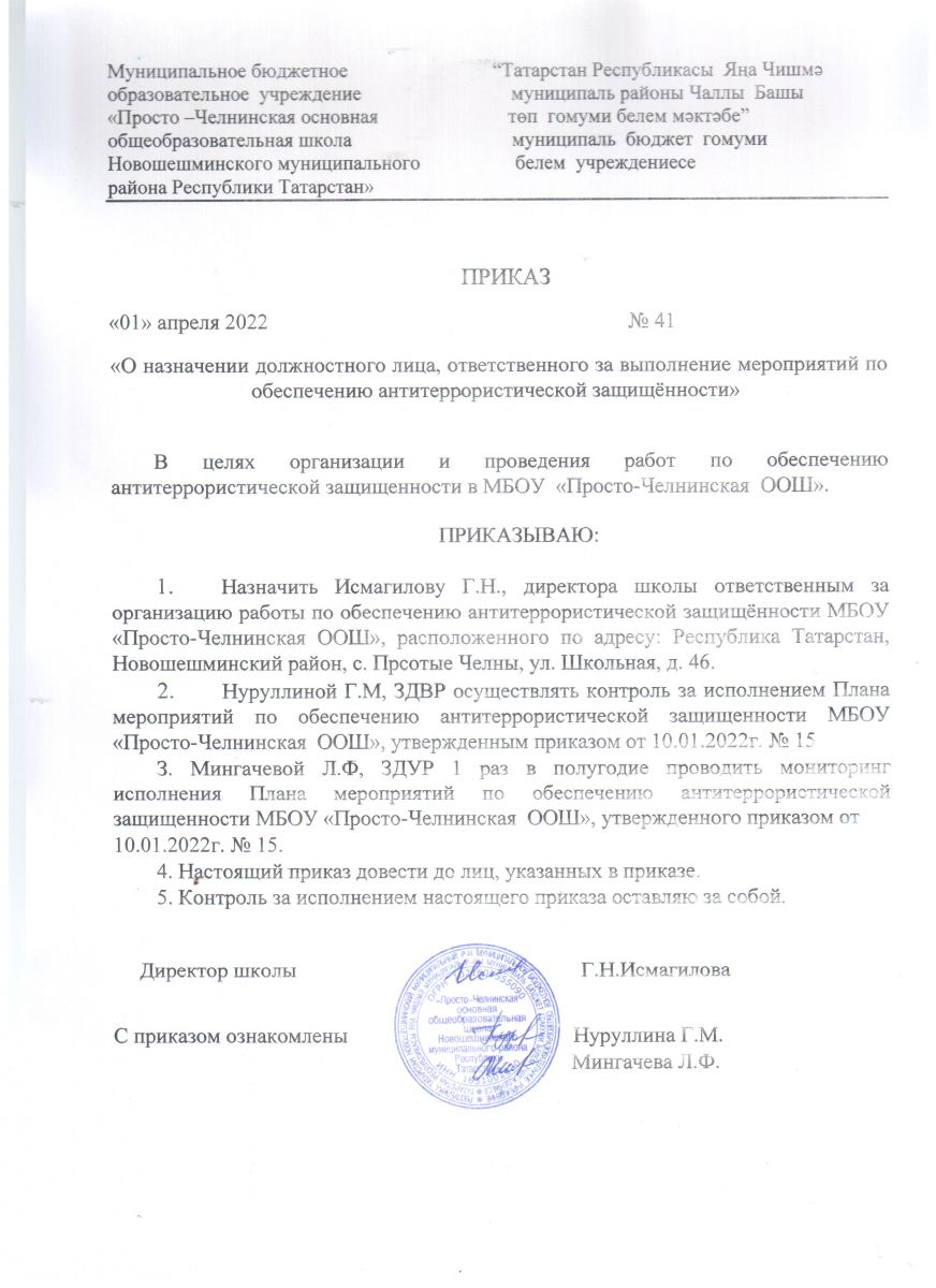 приказ о назначении должностного лица, ответственного за выполнение мероприятий по обеспечению антитеррористической защищенности МБОУ "Просто-Челнинская ООШ", 2022 год
