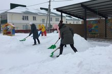 Погода дарит нам "сюрпризы" в виде снега. Воспитатели детского сада в полном составе вышли на очистку детских площадок от снега.