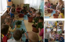 Воспитатель с детьми закрепляла умение поливать растение из лейки, протирать листья влажной тряпочкой, рыхлить землю, поддерживать интерес и желание ухаживать за ними.