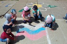 Дети рисовали поздравительные открытки мелками на дорожке д.с. , рассказывали стихи и пели песни .