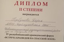 Поздравляем Горбунову Дарью и её руководителя, Горбунову Ольгу Сергеевну, с вторым местом в IV республиканском краеведческом форуме "Встреча краеведов Спасской земле". Успехов и удачи во всех начинаниях!
