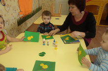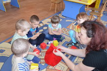 Воспитатель Лашева Л.В. провела занятие в группе раннего возраста на тему "Домик для Матрешки". Цель урока: развитие элементарных конструктивных навыков в процессе действия со строительными деталями. Дети на бумажном шаблоне выкладывают домик, для этого используют фигуры. Во время выполнения задания, воспитатель задает вопросы: "Какова цветы ты взял фигуры?". "Что у тебя получилось?" . По окончанию строительства дети обыгрывают постройки. Чтобы способствовать развитию элементарного сюжета игр, в конце занятия рекомендуется предложить малышам обыграть постройки матрешкам.