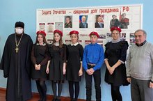 В рамках месячника патриотического воспитания в нашей школе состоялась встреча с Благочинным Новошешминского округа иереем Симеоном Камаевым. В ходе беседы он отметил необходимость исполнения священного долга по Защите Отечества. Как важную составляющую духовно - нравственного воспитания - любовь к ближнему, проявление доброты и уважения к старшим и просто окружающим вас людям. Также из его уст прозвучало напутствие юнармейцам: "С честью исполняйте Клятву, которую каждый из вас давал, вступая в ряды Юнармии". Вместе с ними Благочинный посетил школьный музей, оставив в журнале запись с добрыми словами.