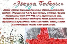 Каждый участник акции изготавливает из красной цветной бумаги звездочку, где указывает Ф.И.О. и фото женщин, воевавших в Великой Отечественной войне 1941-1945 годов, тружениц тыла, вдов. Прикрепляет свою маленькую звездочку на баннер, расположенный в образовательном учреждении в виде большой звезды Победы, которая является наградой за особо выдающиеся заслуги.