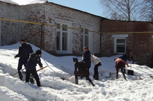 В рамках месячника по благоустройству учащиеся очищают территорию школы от снега.