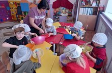 Так, дети старшей группы повторили под руководством воспитателя из чего и как нужно приготовить тесто, закрепили знания о свойствах продуктов, проявили самостоятельность в замешивании теста.