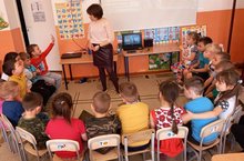 Сегодня нас посетили сотрудники Краеведческого музея нашего района. Они рассказали о жизненном пути поэта Г.Тукая. Организовали для воспитанников детского сада и для учащихся 1 классов просмотр мультфильмов по его произведениям .