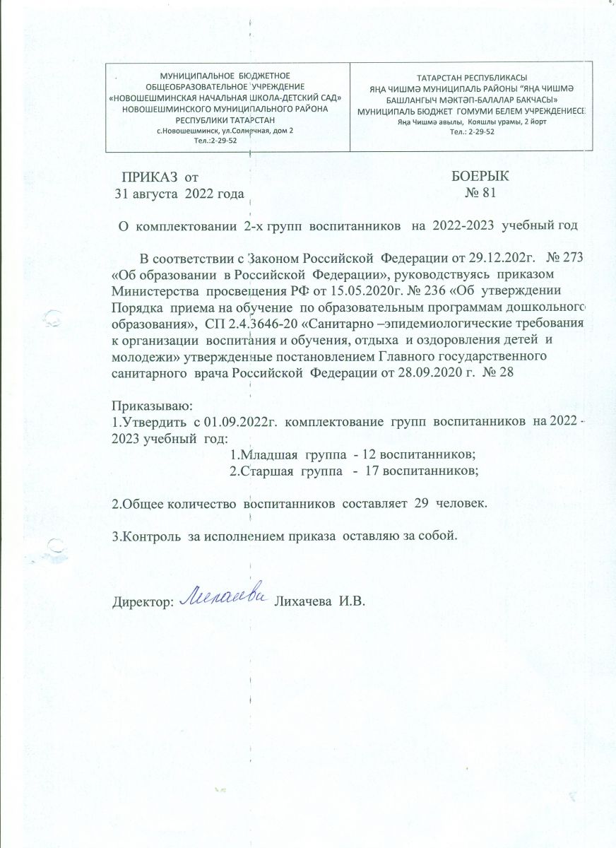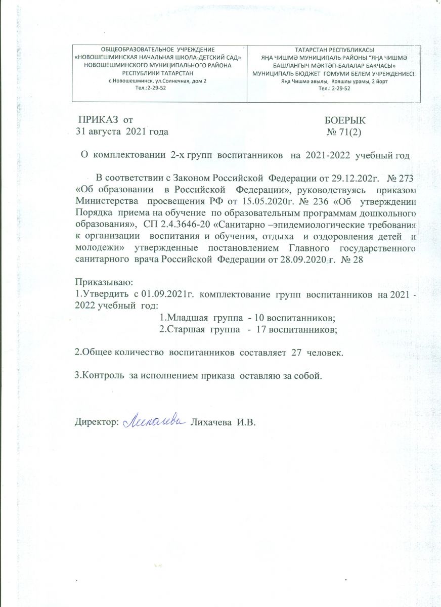 Приказ №83 от 19.10.2021г. в младшую группу-1 воспитанник, в старшую группу- 1 воспитанник.