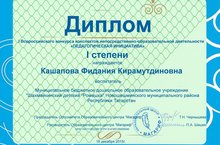 Кашапова Фидания Кирамутдиновна Мәгариф журналы оештырган ""Педагогик инициатива" беренче бутенрәсәй конкурсында катнашып беренче дәрәҗәдәге дипломга ия булды.
