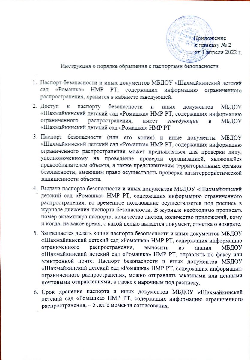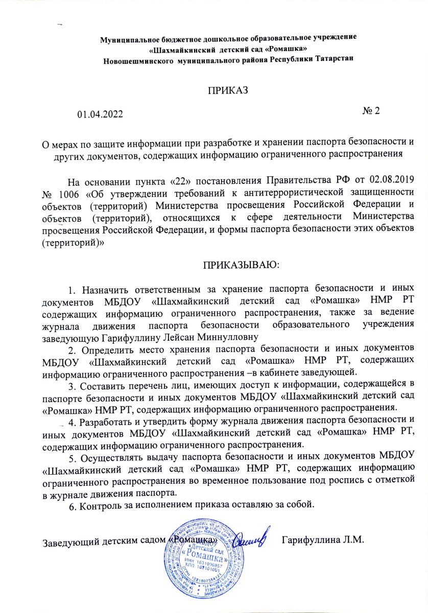 - приказ о мерах по защите информации при разработке и хранении паспорта безопасности и других документов, содержащих информацию ограниченного распространения;