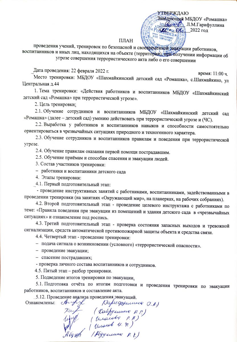 - план проведения учений, тренировок по безопасной и своевременной эвакуации работников, обучающихся и иных лиц, находящихся на объекте (территории), при получении информации об угрозе совершения террористического акта либо о его совершении.