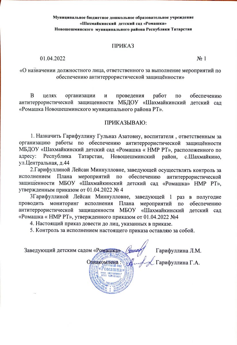 - приказ о назначении должностных лиц, ответственных за проведение мероприятий по обеспечению антитеррористической защищенности объектов (территорий) и организацию взаимодействия с территориальными органами безопасности, территориальными органами Министерства внутренних дел Российской Федерации и территориальными органами Федеральной службы войск национальной гвардии Российской Федерации (подразделениями вневедомственной охраны войск национальной гвардии Российской Федерации);