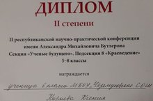Победа в НПК им.А.М.Бутлерова 16.03.2021 13 марта 2021 года ГАО У ДПО «Институт развития образования Республики Татарстан» на базе МБОУ «Лицей №177» Ново-Савиновского района г.Казани была проведена II республиканская научно-практическая конференция имени Александра Михайловича Бутлерова. В работе секции «Ученые будущего», в подсекции «Краеведение» приняла участие учащаяся 6 класса МБОУ «Черёмуховская СОШ» Ксения Корнева (руководитель: Л.Г.Шабалдина, учитель русского языка и литературы), заняла 2 место и награждена Дипломом 2 степени.