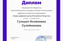 Победитель II Республиканского конкурса «Лидер цифровой школы Республики Татарстан». 23.12.2020 В рамках реализации проекта «Открытая школа 2035» в декабре 2020 года прошел II Республиканский конкурс для учителей «Лидер цифровой школы Республики Татарстан». Конкурс направлен на выявление талантливых педагогов, которые активно используют цифровые инструменты в рамках учебной деятельности, стремятся к развитию ИКТ-компетенций и заинтересованы в освоении новых приемов реализации технологий электронного обучения. Среди учителей начальных классов общеобразовательных школ Новошешминского муниципального района в данном конкурсе приняла участие и стала победителем Сулейманова Гульшат Ислямовна, учитель Зиреклинского лицея. Поздравляем её с победой и желаем дальнейших успехов!