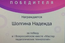 Победитель I Всероссийского педагогического квеста «Мастер педагогических технологий». 09.12.2020 В рамках реализации проекта «Открытая школа 2035» в ноябре 2020 года прошел I Всероссийский педагогический квест «Мастер педагогических технологий». Конкурс направлен на выявление талантливых педагогов, которые активно используют цифровые инструменты в рамках учебной деятельности, стремятся к развитию ИКТ-компетенций и заинтересованы в освоении новых приемов реализации технологий электронного обучения. Среди учителей начальных классов общеобразовательных школ Новошешминского муниципального района в данном конкурсе приняла участие и стала победителем Шолгина Надежда Валентиновна, учитель Новошешминской СОШ. Поздравляем её с победой и желаем дальнейших успехов!