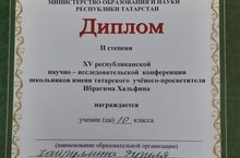 Республиканская конференция им.И.Хальфина 27.01.2020 25 января 2020 года в г.Казани состоялась XV республиканская научно-исследовательская конференция школьников имени татарского учёного-просветителя Ибрагима Хальфина, где на работе секции «Национальная культура в контексте мировой цивилизации. Роль и место Амирхана Еники в татарской культуре» приняла участие учащаяся 10 класса Шахмайкинской СОШ Рузиля Хайруллина (научный руководитель: Гильманова К.К., учитель татарского языка и литературы Шахмайкинской СОШ). Её работа получила высокую оценку жюри – Рузиля награждена дипломом 2 степени .