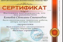 Воспитатель Котова Светлана Степановна вместе со своим воспитанником старшей группы Гатауллиным Ринатом приняли участие в международном дистанционном конкурсе творческих работ в номинации "Рисунок". Они были признаны лауреатами и награждены сертификатом и дипломом.