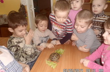 Сегодня состоялось знакомство детей с замечательным животным- черепахой. Воспитателем было рассказано много познавательного о ней. Дети с удовольствием наблюдали за поведением животного, рассматривали ее и, конечно же, они не хотели с ней расставаться. Данное наблюдение для детей было очень поучительным и интересным. Дети были в восторге!!!