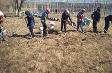 Бу көнне укучылар һәм укытучылар коллективы мәктәп территориясен җыештырырга чыктылар.