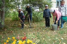 Учащиеся начальных классов занимались уборкой школьной территории.